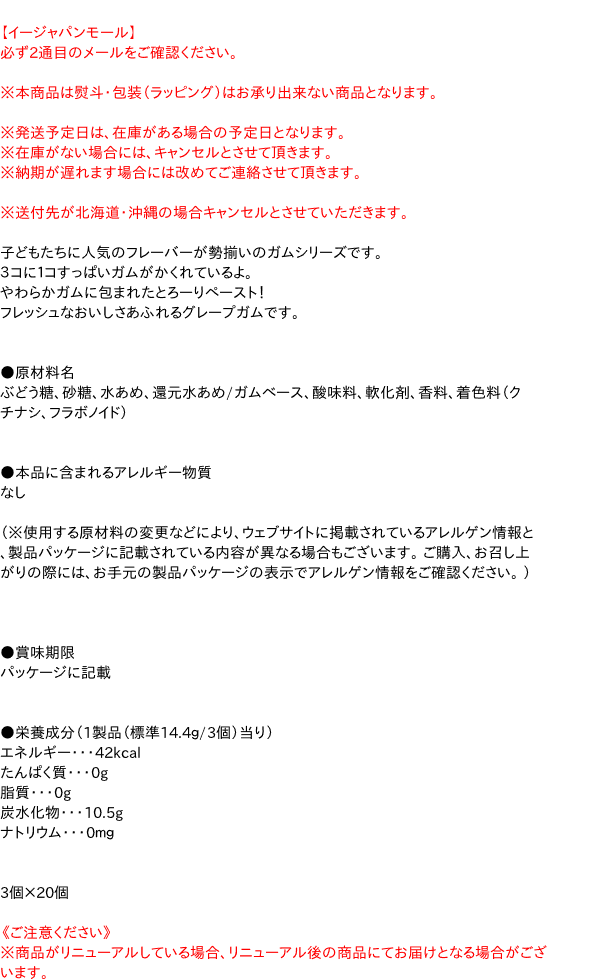 ) ●賞味期限 パッケージに記載 ●栄養成分(1製品(標準14.4g/3個)当り) エネルギー・・・42kcal たんぱく質・・・0g 脂質・・・0g 炭水化物・・・10.5g ナトリウム・・・0mg 3個×20個【メーカー・製造または販売元】コリス株式会社0120-417-090【広告文責】株式会社イージャパンアンドカンパニーズ 072-875-6666《ご注意ください》 ※商品がリニューアルしている場合、リニューアル後の商品にてお届けとなる場合がございます。